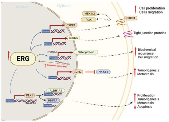 In prostate cancer cells, ERG overexpression increases the rate of epithelial to mesenchymal transitions via the EMT pathway, enhancing the ability of PCa cells to invade and metastasize. ERG achieves this by upregulating matrix metalloproteinases (MMPs), CXCR4, and Osteopontin (OPN), which have been correlated with higher rates of cell invasion and metastasis among patients []. Additionally, the TMPRSS2-ERG pathway reveals the epithelial to mesenchymal transition via the ZEB1/ZEB2 axis in PCa []. The constitutive expression of ERG also hyperactivates the inflammatory pathway in PCa cells by binding to Toll-like receptor 4; this activates the NF-kb pathway, increasing the transcription of target genes such as TNFA, IL6, BCLXL, BCL2, BCLXS, XIAP, and VEGF [,]. These proteins trigger tumor growth and progression by enhancing cell proliferation, survival, and angiogenesis. Tumor growth is further accentuated by the activation of the EZH2 promoter by ERG. This relieves the epigenetic inhibition of tumor suppressor genes such as NKX3.1, resulting in the constitutive expression of the TMPRSS2-ERG fusion gene. In addition to its role in regulating tumor cell invasion and proliferation, ERG also plays an important role in negatively regulating tumor cell differentiation by inhibiting the transcription of genes such as KLK3/PSA and SLC45A3/Prostein []. Altogether, the overexpression of ERG in prostate cancer is a key modulator of tumor progression and aggressiveness, as it can regulate the transcription of the proteins that mediate inflammation, cell invasion, differentiation, and oncogenesis [].