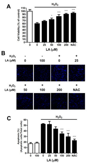 Apoptotic cells were analyzed as previously described [57]. C2C12 myoblasts were cultured on cover glass in 6-well cell culture plates with serum-free DMEM containing LA (0, 25, 50, 100, and 200 µM in 0.5% EtOH) for 24 h. After two washes with PBS, the medium was replaced with 1 mM H2O2 and incubated for 2 h. C2C12 myoblasts were fixed with 4% paraformaldehyde in PBS at room temperature for 30 min. Washed C2C12 myoblasts were mounted using mounting medium with DAPI. The cover glass containing the sample was then reversed and placed on a glass slide. Images for each sample were acquired using a Zeiss LSM710 confocal microscope. The acquisition parameters were kept constant for all images during confocal microscopy. Images were acquired at wavelengths of 358 and 461 nm. Apoptotic cells were counted using the ImageJ software. Typical apoptotic changes include condensation of chromatin, compaction along the periphery of the nucleus, and segmentation of the nucleus [57]. The rate of apoptosis was determined as the percentage of apoptotic nuclei per visual field. Apoptotic cells were calculated using the following equation: apoptosis (%) = [(number of apoptotic cells/number of total cells) × 100]. At least four fields of total and apoptotic cells were counted on each slide, for a total of 500 cells.