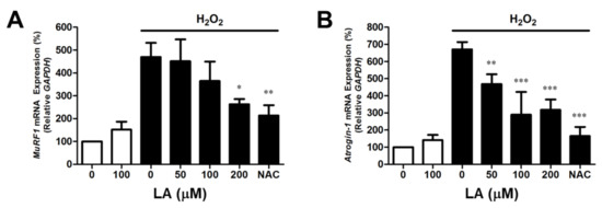 Linoleic acid decreases MuRF1 and Atrogin-1/MAFbx mRNA expression in oxidative stress-induced C2C12 myoblasts. C2C12 myoblasts were cultured with serum-free DMEM containing LA (0–200 µM). Cell lysis and mRNA extraction were performed using Tri-reagent. cDNA was synthesized according to the manufacturer’s instructions. mRNA expression was analyzed by using SYBR Green 1 and a LightCycler ® 96 instrument. (A) MuRF1 mRNA expression. Each value indicates the mean ± SD (n = 6). (B) Atrogin-1/MAFbx mRNA expression. Each value indicates the mean ± SD (n = 6). * p < 0.05, ** p < 0.01, *** p < 0.001 vs. H2O2 alone. The effect of LA was compared with that of 2 mM NAC.