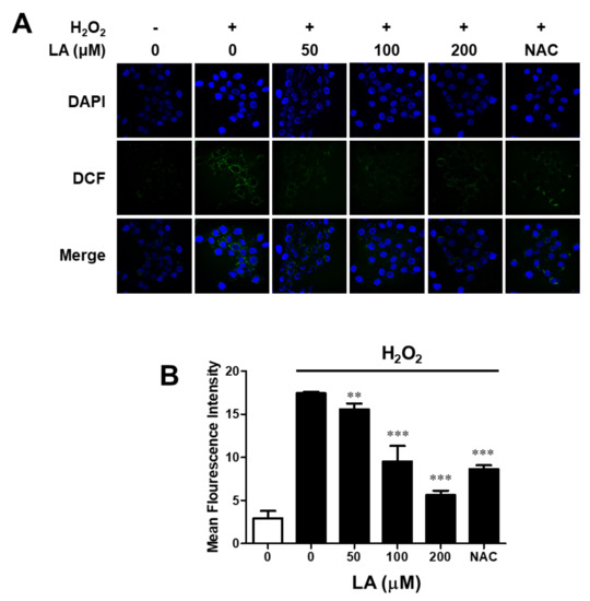 Linoleic acid decreases intracellular ROS synthesis in oxidative stress-induced C2C12 myoblasts. For the estimation of intracellular ROS, DCF was detected using confocal microscopy. (A) The effect of LA on intracellular ROS in C2C12 myoblasts identified using a confocal microscope. C2C12 myoblasts were pre-incubated in serum-free DMEM with LA (0–200 µM) for 24 h, and the medium was replaced with 1 mM H2O2 for 2 h. After incubation, C2C12 myoblasts were treated with 10 µM DCF-DA in PBS for 30 min, fixed with 4% para-formaldehyde in PBS for 30 min, and mounted using a mounting medium with DAPI. DCF was detected at wavelengths of 485 and 535 nm. DAPI was detected at wavelengths of 358 and 461 nm. The effect of LA was compared with that of 2 mM NAC. (B) Quantitating intracellular ROS synthesis. A graph showing average intensity of fluorescence in various GFPs, observed with a confocal laser scanning microscope in the C2C12 myoblast. Data are represented as mean ± SD (n = 3). ** p < 0.01, *** p < 0.001 vs. H2O2 alone.