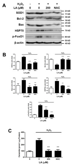 Effect of linoleic acid on intracellular protein and ceramide level of oxidative stress-induced C2C12 myoblasts. C2C12 myoblasts were seeded and cultured in serum-free DMEM with or without 200 mM LA. Protein expression level as analyzed by SDS-PAGE. Cell lysis and protein extraction were conducted using the PRO-PREP protein extraction kit. (A) Effect of LA on SOD1, Bcl-2, Bax, HSP70 and p-FoxO1 protein expression level by oxidative stress in C2C12 myoblasts. (B) Relative density SOD1, Bcl-2, Bax, HSP70 and p-FoxO1 protein expression level. Each value indicates the mean ± SD (n = 3). (C) Effect of LA on ceramide levels under H2O2-induced oxidative stress in C2C12 myoblasts. Ceramide levels as analyzed by HPTLC. Cells were lysed in 0.2 N NaOH. Lipids were extracted using a methanol/chloroform/1 M NaCl solution. Lipids were separated using a silica gel TLC plate and analyzed by HPLC. Each value indicates the mean ± SD (n = 3). ** p < 0.01, *** p < 0.001 vs. H2O2 alone. The effect of LA was compared with that of 2 mM NAC.
