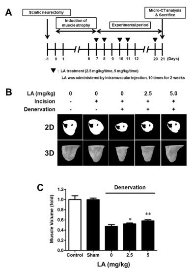 The sciatic nerve was surgically removed to induce muscle atrophy in C57BL/6 mice [25,26,27]. The mice could not use the sciatic-denervated leg and had reduced mobility. After 21 days, the muscle volume of C57BL/6 mice was evaluated using micro-CT and 2D and 3D models (Figure 5A). The muscle size of sciatic-denervated mice was reduced compared to that of the mice in the control group. In contrast, LA (2.5- and 5 mg/kg)-treated mice showed a recovery in muscle volume (Figure 5B,C). This result implies that considerable disuse of the muscle by sciatic denervation induced muscle atrophy, and LA prevented and recovered the atrophy in C57BL/6 mice.