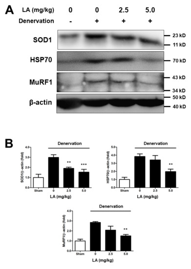 To understand the causes of muscle atrophy, we performed immunoblotting of tissues from mice under oxidative stress. Sciatic-denervated mice had increased SOD1, HSP70, and MuRF1 protein levels, and LA (2.5 and 5 mg/kg) treatment recovered the protein levels to baseline (Figure 6A,B). These results were similar to those observed in C2C12 myoblasts under oxidative stress. Therefore, muscle atrophy caused by sciatic denervation was induced by oxidative stress in mice, and LA prevented and reversed this muscle atrophy.