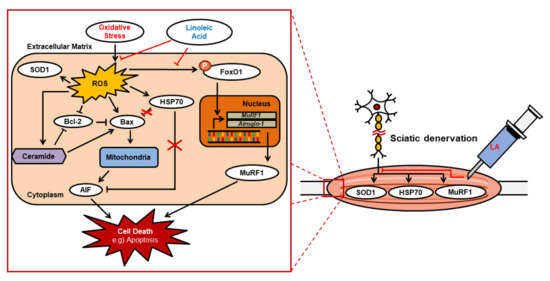 In summary, muscle atrophy was induced in C57BL/6 mice by sciatic denervation to determine whether LA inhibits muscle atrophy. Micro-CT, 2D, and 3D models demonstrated that LA increased muscle volume after sciatic denervation. In addition, we confirmed that ROS-related cellular signaling, including SOD1, Bax, Bcl2, p-FoxO-1, HSP70, ceramide, MuRF1, and Atrogin-1/MAFbx are affected by LA under oxidative stress (Figure 7). Our results showed that antioxidants could be therapeutic agents for muscle atrophy.