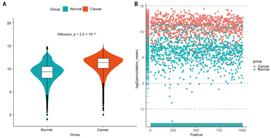 In addition, we randomly selected 1000 features from all the gene-gene interaction edges, and then, the Wilcoxon rank-sum test was performed to compare the difference of the edge perturbation distribution between normal and cancer groups (p < 2.2 × 10−16). The edge-perturbation amplitude was expressed as log2(|Δe,s| + 1) for both normal and cancer samples, as shown in Figure 2A. Next, the difference of the edge-perturbation distribution between normal and cancer samples was shown in a scatter plot (1000 selected features on X axis, log2 transformation of the edge-perturbation amplitude of 1000 selected features on Y axis), as shown in Figure 2B. The edge perturbation of normal samples (blue points) is much denser and less than that of cancer samples (red points). These two plots reveal that the edge perturbations of normal samples are more stable, whereas a wider variation exists in cancer samples, making it possible to find the heterogeneity in pancreatic cancer samples through the edge-perturbation matrix of all samples.