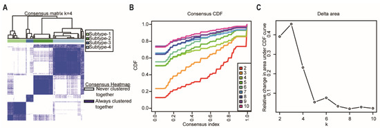 Identification of network-based subtypes by unsupervised consensus clustering. (A) Consensus matrix heatmap of 176 TCGA pancreatic cancer samples when k = 4. The rows and columns represent patient samples, and consensus matrix values vary from 0 in white (indicating that patients are never clustered together) to 1 in dark blue (indicating that patients are always clustered together). (B) Consensus CDF shows a real random variable of its probability distribution based on consensus scores for different subtype numbers (k = 2–10). (C) The delta area plot for k changed from 2 to 10. The vertical axis is the relative change in the area under the CDF curves when the cluster number varies from k to k + 1. The range of k changed from 2 to 10. Abbreviations: CDF, cumulative distribution function; TCGA, The Cancer Genome Atlas.