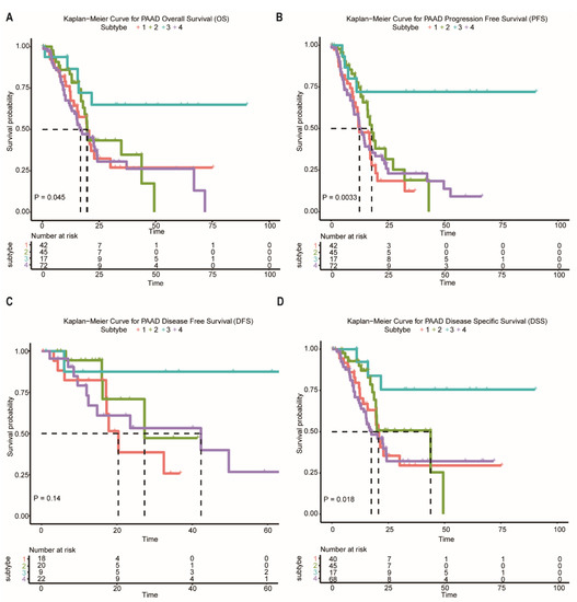 Survival curves of the network-based subtypes. (A–D) Kaplan–Meier curves for the OS, PFS, DFS, and DSS of TCGA pancreatic cancer samples showed that subtype-3 had a better outcome compared with the patients in other subtypes. Abbreviations: OS, overall survival; PFS, progression-free survival; DFS, disease-free survival; DSS, disease-specific survival; TCGA, The Cancer Genome Atlas; PAAD, pancreatic adenocarcinoma.