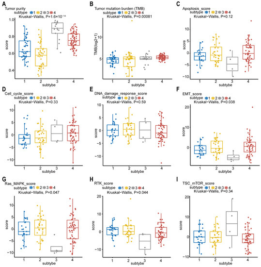 Phenotype heterogeneity among the network-based subtypes. Boxplots show differences in (A) tumor purity, (B) tumor mutation burden, (C) apoptosis, (D) cell cycle, (E) DNA damage response, (F) EMT, (G) Ras/MAPK, (H) RTK, and (I) TSC-mTOR scores from TCGA among network-based subtypes. The data from A were derived from ABSOLUTE. The data from B were obtained using R package “maftool”. The data from C–I were from RPPA data-based scores published by TCGA. The Kruskal–Wallis test was performed to calculate the p-value, and those associations with p-value < 0.05 were considered significant. Abbreviations: EMT, epithelial–mesenchymal transition; MAPK, mitogen-activated protein kinase; RTK, receptor tyrosine kinase; TSC, tuberous sclerosis complex; mTOR, mammalian target of rapamycin; TCGA, TCGA, The Cancer Genome Atlas; RPPA, reverse-phase protein microarray; DNA, deoxyribonucleic acid.