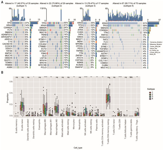 Somatic mutations and immune cell infiltration among the network-based subtypes. (A) The distribution of gene mutations among network-based subtypes. KRAS and TP53 were the top 2 most important mutation according to the importance of ranking in all subtypes. (B) CIBERSORT algorithm showed immune infiltration of 22 immune cells among network-based subtypes. Abbreviations: NK, natural killer; ns, not significant; NA, not applicable. * p < 0.05, ** p < 0.01, **** p < 0.0001.