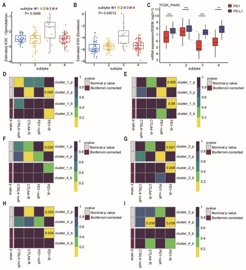 Differences in sensitivity of network-based subtypes to chemotherapy and immunotherapy. (A,B) The box plots showed the estimated IC50 for gemcitabine (A), and docetaxel (B) among network-based subtypes. The Kruskal–Wallis test was performed to calculate the p-value. (C) Expression level of PD-1 and PD-L1 among network-based subtypes of PDAC patients from TCGA dataset. (D–I) Network-based subtypes immunotherapy response prediction. The p values were adjusted by the Benjamini and Hochberg’s approach for controlling the false discovery rate. Abbreviation: TCGA, The Cancer Genome Atlas; PDAC, pancreatic ductal adenocarcinoma; IC50, the half maximal inhibitory concentration; PAAD, pancreatic adenocarcinoma; PD-1, programmed cell death-1; PD-L1, programmed cell death-ligand 1; CTLA-4, cytotoxic T lymphocyte associate protein-4. ** p < 0.01, *** p < 0.001.