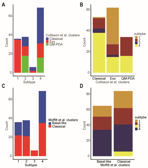 Comparison of the network-based subtypes and Collisson et al. subtypes and Moffitt et al. subtypes. (A) The distribution of the Collisson et al. subtypes in each of network-based subtype. (B) The distribution of the network-based subtypes in each of Collisson et al. subtype. (C) The distribution of the Moffitt et al. subtypes in each of network-based subtype. (D) The distribution of the network-based subtypes in each of Moffitt et al. subtypes. Abbreviations: Exo, exocrine-like; QM-PDA, Quasi-mesenchymal.