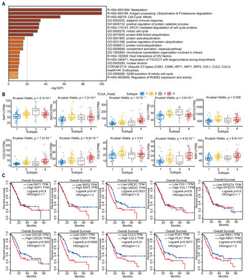 Subtype-3 specific pathways and feature genes. (A) pathways enriched in subtype-3. The horizontal axis represents the negative log (base 10) of the p-value. (B) The differential expression of feature genes in subtype-3, which had the top 10 highest degree in subtype-specific network. (C) Kaplan–Meier curves for the OS of TCGA pancreatic cancer samples showed that higher expressions of UBE2C, CDK1, PLK1, and RBX1 were associated with worse outcome. Abbreviations: TPM, transcripts per million; TCGA, The Cancer Genome Atlas; PAAD, pancreatic adenocarcinoma; PLK-1, Polo-like kinase 1; SKP, S-phase kinase-associated protein; CUL, Cullin; RPS27A, ribosomal protein S27a; CDC, cell division cycle; CDK, cyclin dependent kinase; UBE2C, ubiquitin-conjugating enzyme 2C; RBX, ring-box.