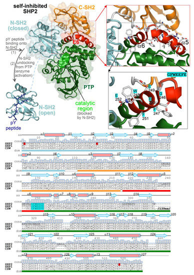Structure of SHP2 and multiple-sequence alignment of tyrosine phosphatases characterized by the same tandem SH2 domain architecture (SHP2, SHP1, and corkscrew). (top) Crystal structures of the self-inhibited SHP2 (Protein Data Bank (PDB) 2SHP) and the isolated N-SH2 domain of SHP2 bound to a pY peptide (PDB 1AYA). The domains are in distinct colors; E6 is in red, and inter-domain linkers are in white. The close-up view highlights E6 and the invariant 246-GFWEEFE-255 segment in more detail. (bottom) Sequence alignment of SHP2, SHP1, and corkscrew with secondary structure elements and amino acid conservation (displayed on top of residues), with ranges of domains and inter-domain linkers (colored bars below the alignment). Mutated and disordered residues in the SHP2 crystal structure are highlighted in red and gray, respectively. The 139 amino acid-long insertion in the corkscrew sequence is omitted (its position is indicated).