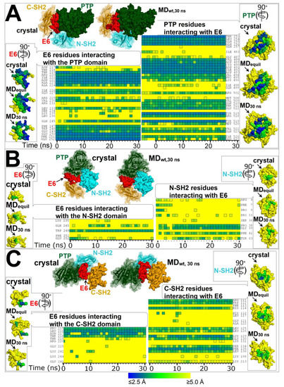 In the self-inhibited enzyme, E6 interacts with all three domains of the SHP2 phosphatase (Figure 1). The residues involved in the interactions of E6 with each domain in the SHP2 crystal structure and at various times of the MD simulation of SHP2-wt are shown in Figure 2 (the individual names of the interacting residues are indicated in correspondence with each heat map row). The most extended interface of interaction with E6 involved the PTP domain, while only a few E6 residues interacted with either N-SH2 or C-SH2. In particular, during the simulation, only one E6 residue at the E6/N-SH2 interface, Trp248, presented stable interaction with N-SH2, while other residues interacted transiently (Lys235, Gln245, Phe251, and Glu252). In the N-SH2 domain, most of the residues interacting with E6 were located in the loop formed by residues 34–40.