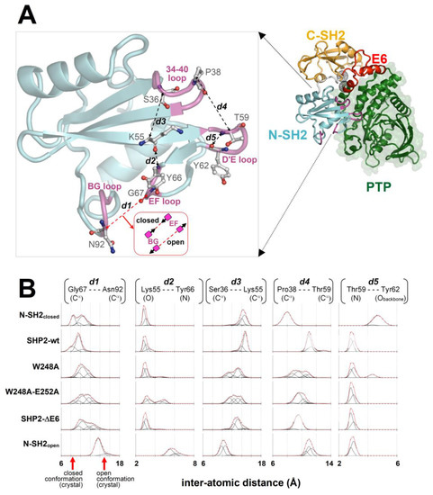 The aim of this study was to understand what the determinants of the closed conformation preference by the N-SH2 domain are when this is docked onto the phosphatase domain. Its synchronism with self-inhibition suggests that the closed conformation might be stabilized by N-SH2 interactions with extra-domain regions. Specifically, these regions could be the phosphatase domain or the exon 6-encoded peptide (E6, amino acids 215–252) as both make physical contact with N-SH2 in the self-inhibited phosphatase, but neither of them interact with the isolated form of N-SH2 (Figure 1). Despite a structured portion of E6 also being packed onto the PTP domain, it does not seem necessary for catalysis, since substrate dephosphorylation still occurs even without most E6 residues, as shown by the SHP2 constructs formed by residues 230–593 [36] and residues 246–547 [37]. E6 conservation among tyrosine phosphatases featuring tandem SH2 domains (SHP1, SHP2, and corkscrew) would suggest importance for this region, but its function remains elusive. To examine whether E6 has a role in the closed conformation, molecular dynamics (MD) simulations were carried out on the N-SH2 domain in different structural contexts: isolated N-SH2 (N-SH2closed, closed conformation; N-SH2open, open conformation), wild-type self-inhibited SHP2 (SHP2-wt), self-inhibited SHP2 carrying mutations weakening the interaction of E6 with N-SH2 (SHP2-W248A and SHP2-W248A/E252A), and self-inhibited SHP2 fully deprived of this interaction (E6 deletion construct, SHP2-ΔE6).