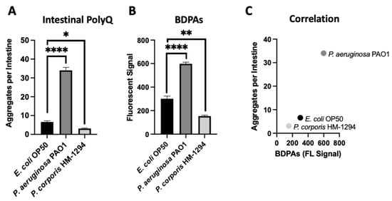 Using C. elegans expressing fluorescently labeled polyQ tracts as sensors for the protein folding environment, we previously identified the effect of bacteria on host proteostasis in a screen of species commonly found in the HGM [12]. Out of over 20 bacterial candidates tested, we found the most robust enhancers and suppressors of polyQ aggregation in C. elegans were P. aeruginosa and Prevotella corporis, respectively. As such, in the present study, we chose these two strains to investigate the influence of BDPAs on host proteostasis. To accomplish this, we assessed the relative abundance of BDPAs in both strains using ProteoStat, a protein aggregate detection assay that has superior specificity to protein aggregates [29], and correlated BDPA levels with the bacteria-mediated induction of polyQ aggregation. In agreement with our previous data, we found that P. aeruginosa significantly induced polyQ aggregation in the intestine relative to the control E. coli strain, while P. corporis significantly suppressed polyQ aggregation upon intestinal colonization (Figure 1A). The ProteoStat assay revealed that the extent of polyQ aggregation enhancement mediated by these bacteria is directly proportional to the abundance of BDPAs that originate from their respective strain (Figure 1B,C). These results suggest that host proteostasis is affected by BDPAs, emphasizing the importance of the bacterial composition within the HGM.