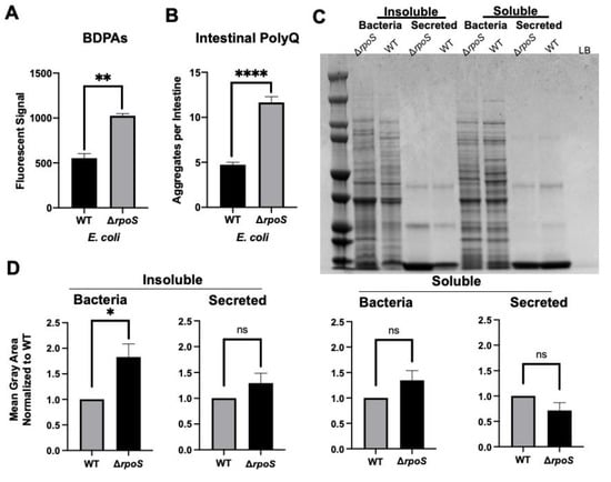 E. coli ΔrpoS has increased levels of BDPAs and its colonization of the C. elegans intestine induces polyQ aggregation. (A) ProteoStat assay quantification of total protein aggregates produced by E. coli wild-type (WT) and rpoS deletion (∆rpoS). Data are represented as the average ProteoStat fluorescent signal per bacterial strain. Each data point is an average of two independent experiments with three internal replicates per run. (B) The effect of E. coli wild-type (WT) and rpoS deletion (∆rpoS) colonization of the C. elegans intestine on polyQ aggregation. Data are represented as the average number of polyQ aggregates per C. elegans intestine. (C) An SDS-PAGE of insoluble and soluble fractions from whole-cell lysate (Bacteria) and supernatant (Secreted) proteins. Image is representative of the results obtained from three independent experiments. Each data point is an average of three independent experiments with a minimum of 84 worms. The empty lane contains Lennox broth medium only (LB). (D) Image-J (FIJI) quantification of proteins from (C). Data are representative of three independent experiments. (A,B,D) Error bars represent SEM. Statistical significance was calculated using Student’s t-test (* p < 0.05, ** p < 0.01, **** p < 0.0001).