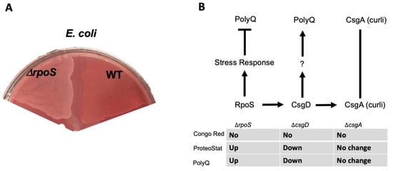 Thus far, our results suggest that bacterial proteomes affect host proteostasis. To further investigate the contribution of bacterial proteins to the stability of host proteostasis, we used an E. coli strain deficient in RpoS, a sigma factor involved in protecting against protein misfolding [28]. As predicted, we found that a deletion of the rpoS gene results in significantly elevated levels of BDPAs compared to wild-type E. coli (Figure 3A). We hypothesized that if bacterial proteins affect the host proteome, then C. elegans colonized by E. coli ∆rpoS should exhibit higher polyQ aggregation. To test this hypothesis, we colonized worms with bacteria carrying the rpoS deletion and, indeed, found a significantly higher polyQ aggregation compared to worms colonized by the wild-type strain (Figure 3B). To confirm that ProteoStat is a sufficient readout of BDPA levels, we extracted and separated soluble and insoluble protein fractions from bacterial cells by sodium dodecyl sulfate-polyacrylamide gel electrophoresis (SDS-PAGE) and visualized total protein by staining the gel with Coomassie (Figure 3C), which is an established method to assess protein aggregate levels [30]. The quantification of stained proteins confirmed that the rpoS knockout had a significantly greater level of insoluble proteins, supporting our ProteoStat data and the overall hypothesis (Figure 3D). Because RpoS is an upstream regulator of the CsgD global transcriptional regulator, which also regulates the expression of the CsgA curli subunit, we wanted to ensure that its deletion abrogates curli production. As expected, RpoS-deficient E. coli cells lacked amyloid proteins (Figure 4A), which was consistent with previous reports [31]; yet, their colonization of the C. elegans intestine increased polyQ aggregation, most likely due to the presence of aggregating proteins that were detected by the ProteoStat assay (Figure 4B).