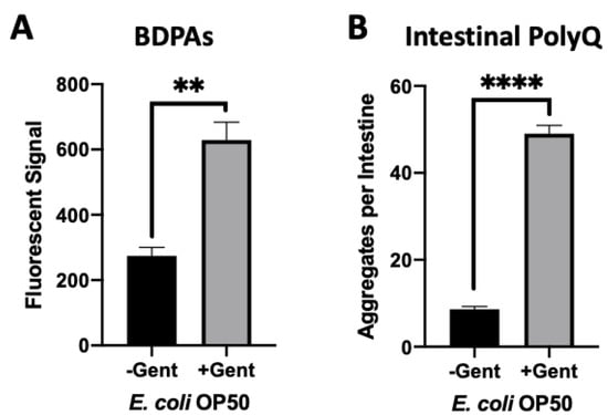 Aminoglycoside antibiotics, such as gentamicin, bind to the bacterial 30S ribosomal subunit leading to mistranslation, an increased presence of misfolded proteins, and eventually cell death [32]. We used a sub-lethal concentration of gentamicin to determine if we could increase the presence of misfolded proteins and consequently affect C. elegans proteostasis upon intestinal colonization. Initially, we assessed the effect of gentamicin on the presence of BDPAs using the ProteoStat assay. We found that a low and non-bactericidal concentration of gentamicin significantly increased the abundance of BDPAs (Figure 5A and Figure S2A). Further experiments demonstrated that colonization of the C. elegans intestine in the presence of a sub-lethal gentamicin concentration on solid nematode growth medium (NGM) significantly enhanced polyQ aggregation (Figure 5B and Figure S2B). These results are intriguing as they suggest that aminoglycosides directly contribute to the disruption of bacterial proteostasis, ultimately affecting the protein folding environment in the host. Collectively, our results further support that BDPAs influence host proteostasis and likely contribute to the onset and progression of PCDs.