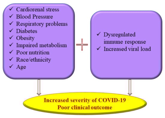 - Ejaz, H.; Alsrhani, A.; Zafar, A.; Javed, H.; Junaid, K.; Abdalla, A.E.; Abosalif, K.O.A.; Ahmed, Z.; Younas, S. COVID-19 and comorbidities: Deleterious impact on infected patients. J. Infect. Public Health 2020, 13, 1833–1839. [Google Scholar] [CrossRef] [PubMed]