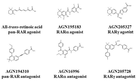 - Hammond, L.A.; Krinks, C.H.V.; Durham, J.; Tomkins, S.E.; Burnett, R.D.; Jones, E.L.; Chandraratna, R.A.S.; Brown, G. Antagonists of retinoic acid receptors (RARs) are potent growth inhibitors of prostate carcinoma cells. Br. J. Cancer 2001, 85, 453–462. [Google Scholar] [CrossRef] [PubMed]
