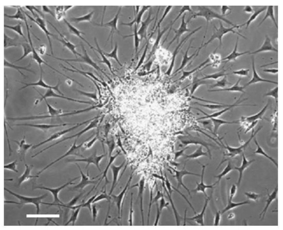 When cells from PNET patient biopsies were cultured in a serum-free neural stem cell medium (Neurocult) supplemented with 20 ng/mL epidermal growth factor they generated neurospheres which produced differentiated cells that migrated (Figure 3). The cells that give rise to neurospheres are CSCs. The activity of the pan-RAR antagonist AGN194310 was examined against two pediatric PNETs and a pediatric astrocytoma. These cells were plated into wells, treated with AGN194310, and cellular ATP levels were measured on day 5. AGN194310 was highly effective against the two pediatric PNETS and the pediatric astrocytoma. Neurospheres and their progeny were completely ablated by 10−6 M AGN194310. ATRA and the RARα antagonist AGN195183 were somewhat ineffective [53].