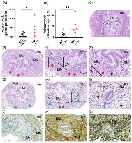 - Oh, S.J.; Shin, J.H.; Kim, T.H.; Lee, H.S.; Yoo, J.Y.; Ahn, J.Y.; Broaddus, R.R.; Taketo, M.M.; Lydon, J.P.; Leach, R.E.; et al. β-Catenin Activation Contributes to the Pathogenesis of Adenomyosis through Epithelial-Mesenchymal Transition. J. Pathol. 2013, 231, 210–222. [Google Scholar] [CrossRef] [PubMed]