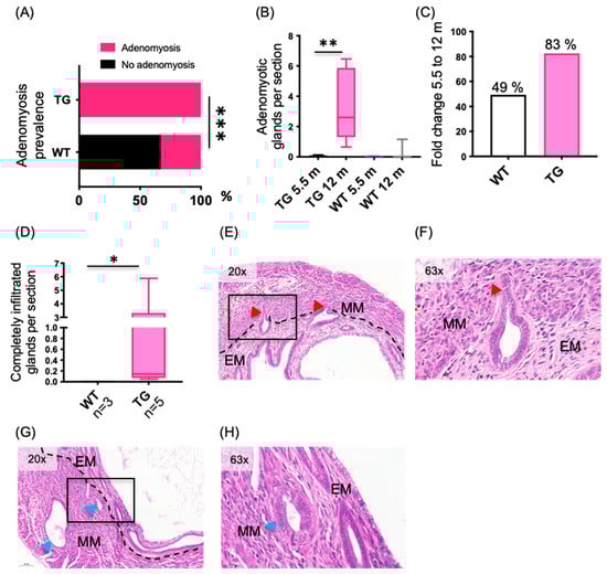2.2. HSD17B1TG Mice Develop an Adenomyosis-like Phenotype at the Age of 5.5 Months