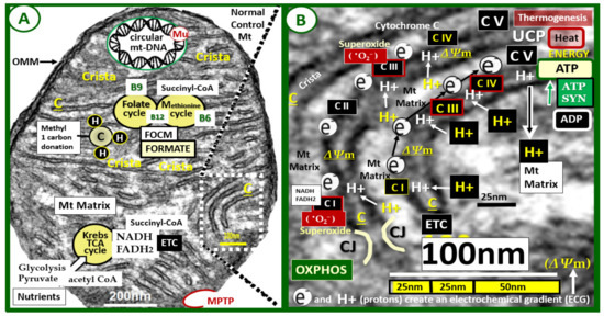 Mitochondria (Mt) are highly dynamic and mobile cellular organelles that contribute to homeostasis by maintaining energy for cells to function in the form of adenosine-5′-triphosphate (ATP) [1,2,3,4,5,6,7,8]. They are unifying organelles and metabolic hubs, which ultimately determine cellular homeostasis for survival, and cellular death when they are remodeled and damaged to an aberrant phenotype. Further, a decrease or loss of ATP from Mt places cells in great danger of survival. Specifically, Mt serve to produce energy from the tricarboxylic acid (TCA) or Krebs cycle and fatty acid beta-oxidation in the electron transport chain (ETC) in the form of ATP, which are essential for proper cellular functioning and life. Additionally, Mt generate low levels of reactive oxygen species (ROS) in the form of superoxide via the electron transport chain (ETC) that are important for physiologic cell signaling and maintaining cellular homeostasis (Figure 1) [1,2,3,4,5,6,7,8].