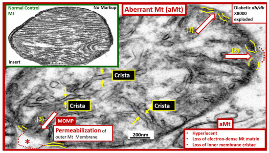 Aberrant mitochondria (aMt). This image depicts an exploded aberrant mitochondrion with an intact scale bar from a 20-week-old obese, insulin-resistant, diabetic db/db female mouse model. aMt are a common phenotype found in multiple different cells and organs in models of obesity, insulin resistance, metabolic syndrome, and type 2 diabetes mellitus as compared to control healthy C57BL/6J models (insert upper left from Figure 1A). The mitochondria organelles, along with the nucleus are known to be contained by outer and inner membrane structures similar to the cellular plasma membrane (fine yellow lines of the mitochondrion outer and inner membranes). This aberrant mitochondrion depicts the ultrastructural remodeling that is found to be present in almost all of the subsequent TEM images. aMt may be characterized by their hyperlucency, loss of cristae (yellow arrows), loss of electron-dense mitochondrial matrix, and loss or disruption of the outer membranes (red open arrows). aMt are known to be leaky with disruption or loss of the Mt outer membranes as depicted in (1) thinning of the inner and outer membranes (open red arrow); (2) interruption of the inner and outer membranes with partial permeabilization (open red arrow and red dashed line); (3) complete loss of the inner and outer membranes with permeabilization of the outer membrane (open red arrow, dashed red lines, and asterisk). Importantly, the mitochondrial outer membrane permeabilization (MOMP) allows the contents of the Mt to leak damaging superoxide—mitochondria reactive oxygen species (mtROS), which are capable of reacting with nitrogen, and sulfur species from the iron-sulfur complexes known to be present in complex I and the cytosol to form a reactive species interactome (RSI) consisting of reactive oxygen, nitrogen, sulfur species (RONSS), and the apoptotic death-promoting protein cytochrome c. Additionally, MOMP allows the leakage of mtDNA that can activate damage-associated molecular patterns (DAMPs) that are capable of initiating a sterile inflammatory response by binding to pattern-recognition receptors. Importantly, MOMP is considered to be a ‘point of no return’ as this event is responsible for engaging the apoptotic cascade in numerous cell death pathways. The development of MOMP is thought to be associated with the pro-apoptotic BCL-2-associated X protein (BAX) or B-cell lymphoma-2 (BCL-2) antagonist or killer (BAK). However, it is important to also note that an increase in nutrient excess and resultant mtROS may damage the outer membrane lipoproteins via mtROS induced lipid peroxidation, propagation of lipid peroxidation chain reactions, and increase the opportunity for MOMP to occur from the “inside-out” to damage the outer Mt membrane. Additionally, the emerging role of activated mitochondrial matrix metalloproteinases (mtMMPs) may also play a role in outer membrane permeabilization. This aberrant phenotype results in a loss of function of the electron transport chain responsible for the production of cellular energy—adenosine triphosphate (ATP). Importantly, if there is an impairment in mitophagy, leaky aMt via mitochondria permeability transition pores (MPTPs) and MOMPs will accumulate in cells and contribute to ongoing cellular dysfunction and damage due to ATP depletion and eventually cellular apoptosis via cytochrome c. Original magnification ×8000; with intact scale bar = 200 nm. TEM = transmission electron microscopy.