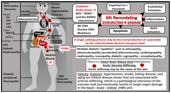 Mitochondria (Mt) remodeling to an aberrant Mt (aMt) phenotype with dysfunction and damage to organ systems. This figure is an illustration of proposed mitochondrial-mediated mechanisms of disease development and progression associated with aMt dysfunction and damage that have been implicated in numerous organ systems and clinical diseases (left-hand standing man image). Oxidative—redox stress includes the sum of reactive oxygen species (ROS), reactive nitrogen species (RNS), and reactive sulfur species (RSS) to create the reactive oxygen, nitrogen, sulfur species (RONSS) interactome. Importantly, aortic stiffening may be the nexus for a heart-brain-kidney axis (red circles) illustrating the aortic vascular pathway of vascular stiffening to affect the carotid and renal arteries and target organs of the heart-brain-kidney axis. AAA = abdominal aortic aneurysm; Ca++ = calcium transients; CAD = coronary artery disease; CHF = congestive heart failure; CKD = chronic kidney disease; Dd = diastolic dysfunction; DNA = deoxyribonucleic acid; IR = insulin resistance; LVH = left ventricular hypertrophy; NAFLD = non-alcoholic fatty liver disease; PAD = peripheral arterial disease; RAAS = renin-angiotensin-aldosterone system; T1DM = type 1 diabetes mellitus; T2DM = type 2 diabetes mellitus.