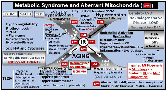 The metabolic syndrome (MetS) and aberrant mitochondria (aMt). This image illustrates how the complex MetS and aMt can have a tremendous interaction and impact with multiple crosstalk as they intersect. In its simplest form, the MetS may be characterized by the clustering of multiple metabolic abnormalities and clinical disease states associated with multiple vulnerabilities. The central “X” in this figure honors Jerry Reaven [18] who initially coined the term Syndrome X and championed the concept that the resistance to insulin-mediated glucose disposal—insulin resistance (IR) was a characteristic of patients with type 2 diabetes mellitus (T2DM) and cerebrocardiovascular disease (CVD), which was later termed MetS by Scott Grundy [19]. There are four arms to this letter X and each arm has a designated condition to further illustrate the “H” phenomenon, representing a “hyper” state, e.g., hyperlipidemia, lower left; pancreatic islet β-cell hyperinsulinemia/hyperamylinemia, lower right; hypertension and vascular stiffening, upper right; hyperglycemia, upper left. Note how IR is placed central to each of the four arms and how it is surrounded by aMt, which represents Mt dysfunction and damage [17]. Each of the four arms is important and note the arrows depicting that IR can impact each of the tissues and the clinical disease states. Further, note that the central IR is surrounded by the red coloring of the aMt that are so important to this review. Additionally, the MetS constitutes a milieu conducive to tissue oxidative-redox stress. Oxidative-redox stress incorporates the sum of reactive oxygen, nitrogen, and sulfur species stress (RONSS) and its cellular RONSS interactome and inflammation that create a vicious cycle. The multiple metabolic toxicities associated with the MetS including the RONSS interactome and endothelial dysfunction combine to weave a complicated mosaic fabric, which is also known to be associated with the activation of the renin-angiotensin-aldosterone-system (RAAS). Additionally, cerebrocardiovascular disease (CVD), which includes neurodegenerative disease such as late-onset Alzheimer’s disease (LOAD) and/or a diabetic encephalopathy and chronic kidney disease (CKD) together comprising the heart–brain-kidney axis that is involved when there is aortic vascular stiffening associated with MetS and T2DM. It is important to note that hyperinsulinemia is initially protective and a compensatory response to nutrient overload; however, if hyperinsulinemia due to IR remains chronic there is a price to pay by becoming a central commonality along with the development of aMt and the development of RONSS interactome and its detrimental role in each of the four arms of the syndrome X and its clinical disease states and syndromes. The addition of aMt adds even further strength to understanding the important role of the MetS since Mt function plays a key role in IR in general and even more so in T2DM. Importantly, homocysteine (Hcy) and hyperhomocysteinemia (HHcy) could be added to the “H” phenomenon, since HHcy is an independent risk factor for cerebrocardiovascular disease (CVD) and hypertension and vascular stiffening in addition to being a biomarker for impaired folate one-carbon metabolism. AGE = advanced glycation end products; Ang II = angiotensin II; CKD = chronic kidney disease; CVD = cerebrocardiovascular disease; eNOS = endothelial nitric oxide synthase; ER = endoplasmic reticulum; ESRD = end-stage renal disease; FFA = free fatty acids; FOCM = folate-mediated one-carbon metabolism; HPA = hypothalamic–pituitary–adrenal axis; LOAD = late-onset Alzheimer’s disease; Mt = mitochondria; NADPH Ox = nicotinamide adenine dinucleotide phosphate oxidase; NAFLD = non-alcoholic fatty liver disease; NASH = non-alcoholic steatohepatitis; O2 = oxygen; PAI-1 = plasminogen activator-1; RAGE = receptor for AGE; SNS = sympathetic nervous system; XO = xanthine oxidase.