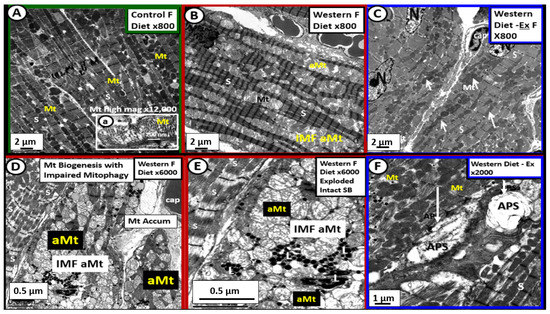 The myocardium must also be prepared to rapidly adapt to stressors such as hypertension and increased demands to work against an increased stiffened vascular system that occurs when there is systemic vascular stiffening and increased myocardial end-diastolic load [16,21,22,23]. The myocardium does this, due to its unique compensatory mechanism of adaptive Mt biogenesis. This can be appreciated by observing the marked increased expansion in the number of intermyofibrillar (IMF) Mt. However, if these increased stressors are sustained such as occurs in nutrient excess, the Mt will also develop impaired mitophagy as observed in obesity, IR, MetS, impaired glucose tolerance, and T2DM. Uncoupling of mitophagy from biogenesis due to impaired mitophagy and accumulation of aMt that occurs in obesity, IR, and T2DM is intriguing and not totally understood. However, there is ongoing research to figure out why impaired mitophagy is associated with Mt biogenesis. Further, this disequilibrium (Mt uncoupling) between impaired mitophagy and Mt biogenesis results in cardiomyocyte dysfunction, abnormal remodeling with fibrosis and stiffening of the heart, and even myocyte death due to apoptosis [24]. The following TEM images allow one to view myocardial Mt biogenesis and aMt accumulation due to impaired mitophagy in the female DIO-Western (Figure 6) [25], obese, female diabetic db/db (Figure 7) [26], and the IR, impaired glucose tolerance, hypertensive, lean, male Ren2 models (Figure 8) [27].