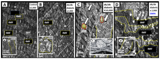 Mitochondria (Mt) biogenesis with impaired mitophagy in the 16-week-old obese, insulin-resistant, female diabetic db/db mice. Panel A illustrates a row of sarcomeres alternating with a row of intermyofibrillar (IMF) Mt in the lean non-diabetic control model. Panels B and C depict extensive Mt expansion due to Mt biogenesis with sarcomere disarray and accumulation of aberrant Mt (aMt) (open arrows and encircled yellow with red line). Note the presence of numerous hyperlucent aMt with loss of electron-dense Mt matrix and attenuation of crista as depicted in inserts (b) and (c) as compared to the control model in insert (a). These aMt are representative of impaired mitophagy, which allow aMt to accumulate. Additionally, these aMt are leaky and release increased superoxide–mtROS and cytochrome c, which in turn is associated with cardiomyocyte dysfunction and increased cardiomyocyte apoptosis. Panel D demonstrates an improved sarcomere (S) arrangement and note the marked improvement of electron-dense mitochondria in insert (c). Additionally, note the improvement of the Mt expansion and note that in insert (d) the Mt are more electron-dense and appear similar to control models in insert (a) in those models treated with empagliflozin (a sodium glucose transporter-2 inhibitor) for five weeks. These modified images were provided with permission by CC 4.0 [26]. Magnification ×2000 in panels A, B and D; scale bar = 1 μm and Magnification ×10,000; scale bar = 500 nm in panel C. Inserts = 0.5 μm in panels (a), (b), (d); scale bars = 200 nm in insert (c).