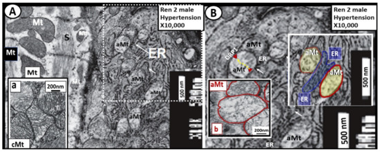 A close relationship exists between both the structural and functional relationship between Mt and the endoplasmic reticulum. This ultrastructural relationship to demonstrate the tight structural arrangement between the myocardial ER and aMt ultrastructure was identified in male Ren2 hypertensive, insulin-resistant models with impaired glucose tolerance (Figure 8) [27].