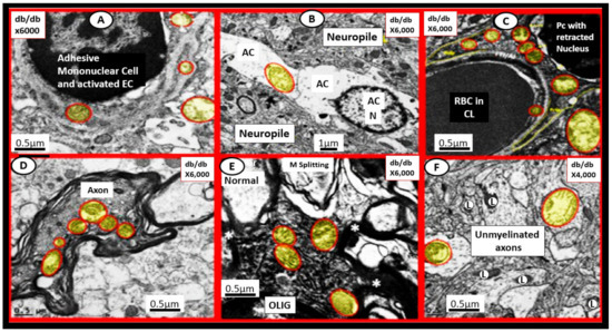 Aberrant mitochondria (aMt) are present in multiple cell types in the brain in the female 20-week-old diabetic db/db mouse. In contrast to the electron-dense Mt found in control healthy Mt, the aMt (pseudo-colored yellow and outlined in red) are hyperlucent with loss of electron-dense matrix and loss of cristae that are found in the brain endothelial cells (EC) (panel A), astrocyte (AC) (panel B), pericytes (Pc) and their foot processes (panel C), myelinated neuronal axons (panel D) and unmyelinated axons (panel F), and oligodendrocyte (OLIG) (panel E). These aMt are in addition to the aMt found in reactive-activated microglia in next Figure 10. Note that there is no control image in this figure; however, the control image in panel A in the next Figure 10 may be utilized as a control for this image since they were from the same experimental study. These modified images are provided by CC 4.0 [32,33,34,35,36]. Magnifications vary (upper panels) and scale bars (bottom panels) are included in each panel. Asterisk = Myelin (M); L = lysosome; RBC = red blood cell.