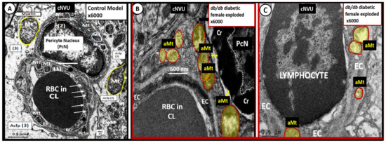 The mural pericyte (Pc) and endothelial cell (EC) of the capillary neurovascular unit (NVU) develop remodeled aberrant mitochondrial (aMt) in the 20-week-old female diabetic db/db models. Panel A demonstrates the normal electron-dense mitochondria (Mt) in the Pc and EC (outlined with white lines) in the cytoplasm. Additionally, note the arrows pointing to the tight and adherens junctions and normal electron-dense Mt in the astrocyte foot processes (outlined in yellow). Panel B depicts the aMt (pseudo-colored yellow outlined in red) in the Pc cytoplasm as compared to the normal Mt in panel A. Panel C depicts the aMt in the EC (pseudo-colored yellow outlined in red) as compared to the normal Mt in panel A. Note the excessive chromatin (Cr) condensation in the Pc nucleus. Panels B and C are exploded cropped images and these images were observed during the studies in references [32,33,34,35,36] provided by CC 4.0. Original magnification ×6000 exploded with intact scale bars of 500 nm (panel B) and 0.5 μm (panels A and C). Acfp = astrocyte foot process; CL = capillary lumen; Pcfp = pericyte foot processes; PcN = pericyte nucleus; RBC = red blood cell(s).