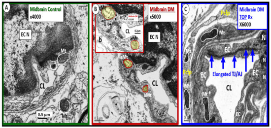 Importantly, there is a specific Mt carbonic anhydrase inhibitor that has been observed to have an effect on protecting healthy Mt from undergoing aMt changes named topiramate. Topiramate (approved for the treatment of seizures) has been shown to decrease ROS and oxidative stress in the brain by the specific inhibition of the Mt carbonic anhydrase in streptozotocin-induced diabetes [38,39,40,41,42]. In the male CD-1 streptozotocin-induced diabetic model, the brain had increased permeability to 14C-sucrose due to the attenuation and/or loss of the BBB via the attenuation or loss of EC tight and adherens junctions. Additionally, this model had an attenuation and/or loss of the supportive pericytes of the neurovascular unit due to increased oxidative stress at 16-weeks post-induction of diabetes. This model is known to have increased oxidative stress and increased permeability in the midbrain. In this same experiment, observations of aMt were present in the EC cytoplasm that were prevented with topiramate (50 mg/kg body weight) (Figure 12) [38].