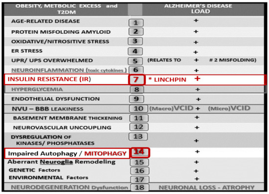 There are multiple intersecting risks between obesity, metabolic syndrome (MetS), insulin resistance (IR), type 2 diabetes (T2DM), and late-onset Alzheimer’s disease (LOAD). This figure depicts at least 18 intersecting risks or links between these two disparate chronic age-related diseases. Importantly, these intersecting risks may contribute to the increased risk of LOAD in those individuals with obesity, MetS, IR, and T2DM. Additionally, advanced glycation end products (AGE) and its receptor, the receptor for advanced glycation end products (RAGE) are important to number 8 hyperglycemia in generating reactive oxygen species and AGE could also complete with RAGE for Aβ degradation. Note that IR (number seven with asterisk) is highlighted in red as it may be considered to be the linchpin between T2DM and LOAD and further emphasizes its central role and location of IR in the MetS in previous Figure 4. Additionally, note that impaired autophagy/mitophagy (number 14) is also highlighted in red due to its role in the accumulation of aberrant mitochondria. Modified with permission by CC 4.0 [36]. Aβ = amyloid beta; BBB = blood-brain barrier; ER = endoplasmic reticulum; NVU = neurovascular unit; UPR/UPS = unfolded protein response/unfolded protein response—endoplasmic reticulum stress.