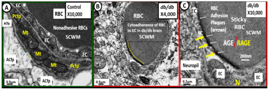 Cytoadherence of red blood cell(s) (RBCs) to the neurovascular unit (NVU) brain endothelial cells (BECs) in subcortical white matter (SCWM) regions in the obese, insulin resistant diabetic db/db mice. Panel A demonstrates the relationship between the NVUs RBC and the BEC. Note that while the RBC comes in close proximity to the BEC, it does not adhere to it. Asterisks denote a definite space between the RBC and BEC. Panel B depicts a low magnification image of the NVU and note that the RBC in this capillary lumen appears to be adherent to the BEC (yellow dashed line). Panel C depicts a definite highly electron-dense adhesion plaque between the capillary RBC and the endothelium (arrows) of the neurovascular unit. There is known to be an increase in RBC HbA1c and advanced glycation end-products (AGE) that may locate to the surface of RBCs and this could bind to the increase in the receptors of the advanced glycation end-products RAGE known to be increased in the BECs of diabetes. This AGE/RAGE interaction helps to better understand this attraction between the RBC and BEC and additionally helps to understand the formation of the electron-dense adhesion plaques observed. Additionally, the BEC glycocalyx is known to be damaged and attenuated in the diabetic db/db pulmonary capillaries and the diabetic BTBR ob/ob preclinical mouse models that would also support RBC cytoadhesion (Section 5.1). Incidentally, there were similar RBC cytoadhesions in left ventricle capillaries of the myocardium in female db/db mice at 20-weeks of age in this same model. Images modified with permission by CC 4.0 [32,36]. Magnification ×10,000; scale bar = 0.5 μm (panel A), ×4000; scale bar= 0.5 μm (panel B), ×10,000; scale bar = 0.2 μm (panel C). ACfp = astrocyte foot processes; Mt = mitochondria; Pcfp = pericyte foot processes.