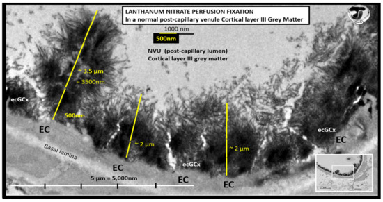 Exploded transmission electron microscope (TEM) image of a perfusion fixed control. lanthanum nitrate-stained post-capillary venule in cortical layer III of the frontal grey matter regions in a CD1 mouse model at seven-weeks of age. Note the marked electron-dense endothelial glycocalyx (ecGCx) on the luminal-apical brain endothelial cell (BEC). In this healthy control model, the ecGCx varies from ~2 to 3.5 μm in thickness. Note how the apical fronds of the ecGCx can readily interact with proteins of the circulating plasma. This staining technique has now been found to be both reliable and reproducible by author and others [52,57,58]. Note the original image in the lower-right insert with scale bar = 5 μm. Scale bar = 500 nm utilized to measure the ecGCx thickness in the exploded image.