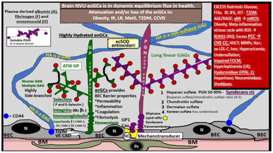 Brain endothelial cell glycocalyx (ecGCx) of the neurovascular unit (NVU). This illustration depicts the components of the ecGCx: a unique extracellular matrix. The ecGCx is composed of two classes of proteins that are mostly anchored (proteoglycan(s) (PGN) (purple), glycoprotein(s) (GP) (green)) and of hyaluronic acid (HA) hyaluronan (an exceedingly long polymer of disaccharides considered to be a glycosaminoglycan (GAG)) (blue). HA may be either unattached (free-floating), attached to CD44 brain endothelial cell(s) (BEC) plasma membrane, or form HA-HA complexes. Non-sulfated HAs not anchored to the BECs may reversibly interact at the lumen with plasma-derived albumin, fibrinogen, and soluble PGNs. The PGNs and GPs side chains consist of glycosaminoglycans (GAGs) covalently bound to core proteins and are highly sulfated (red dots). The two primary PGNs are syndecans and glypicans (purple). The glycoproteins (green) consist primarily of selectins (P and E), integrins (alpha v and beta 3) and immunoglobulin superfamily of ICAM-1, VE-CAM, and PE CAM. Caveolae are invaginations of lipid rafts in the endothelial plasma membrane and contain CD44, which anchors hyaluronan to the BEC plasma membrane, and glycosylphosphatidylinositol (GPI), which anchors glypican-1. The GPI/glypican-1 interaction is thought to be responsible for mechanotransduction in order to activate endothelial nitric oxide synthase (eNOS) to produce bioavailable nitric oxide (NO) via the calcium-calmodulin-dependent Caveolin-1 (Cav-1) protein. Importantly, note the red box (upper right), which contains a brief summary of factors that may be responsible for the attenuation and/or loss (shedding) of the ecGCx. Image modified with permission by CC 4.0 [52]. AGE/RAGE = advanced glycation end-products and its receptor; aMt = aberrant mitochondria; ATIII = antithrombin III; CD44 = cluster of differentiation 44; CNS CC = central nervous system cytokines/chemokines; ecSOD = extracellular superoxide dismutase; FFAs = saturated free fatty acids; FOCM = folate-mediated one-carbon metabolism; HHCY = hyperhomocysteinemia; IFG = impaired fasting glucose; IGT = impaired glucose tolerance; IR = insulin resistance; LR = leptin resistance; ox-LDL-C = oxidized low-density lipoprotein-cholesterol; MMPs = matrix metalloproteinases; mtROS = mitochondrial reactive oxygen species; Na+ = sodium; N = nucleus; PCC = peripheral cytokine/chemokines; RAGE = receptor for AGE; RONSS = reactive oxygen, nitrogen, sulfur species; ROS = reactive oxygen species; RSI = reactive species interactome; TJ/AJ = tight junctions/adherens junctions; T2DM = type 2 diabetes mellitus; VE CAD = vascular endothelial cadherin.