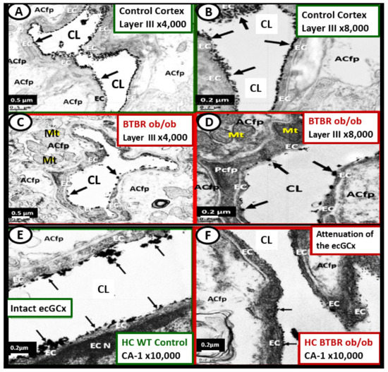 Lanthanum nitrate (LAN) staining of the neurovascular unit (NVU) endothelial glycocalyx (ecGCx) brain endothelial cells (BECs) in the female, obese, insulin resistant, diabetic BTBR ob/ob preclinical mouse models at 20-weeks of age reveal an attenuation and/or loss of the ecGCx as compared to control models. Panels A and B demonstrate the marked electron-dense staining of the ecGCx (arrows) on the luminal surface of BECs with LAN perfusion fixation. Panels C and D depict a marked attenuation of the ecGCx and even in some area it appears to be completely lost. Note that the ecGCx appears to clump and that it is discontinuous as compared to the continuous coverage in control models (panels A and B). Panel E demonstrates the decoration of the BECs by the ecGCx in the hippocampal CA-1 regions in control models. Panel F depicts an almost complete loss of the ecGCx on the surface layer of BECs as compared to the control (panel E). Here it is important to note that there were no mitochondria abnormalities observed in the BTBR ob/ob models as compared to images that were present in the db/db models previously discussed. Overall, we found the ultrastructural remodeling changes to be less in the BTBR ob/ob models as compared to the db/db in regard to NVU pericytes, ACs, and BBB tight junction abnormalities including less brain atrophy as compared to the db/db models. This may suggest that ecGCx may be an early remodeling change in the diabetic BTBR ob/ob. Images modified and provided by CC 4.0 [52]. Magnification ×4000; scale bar = 0.5 μm (panels A and B); Magnification x8000; scale bar = 0.2 μm (panels B and D); Magnification ×10,000; scale bar = 0.2 μm (panels E and F). ACfp = astrocyte foot processes; CA-1 = Cornu Ammonis-1; CL = capillary lumen; HC = hippocampus; Mt = mitochondria; Pcfp = pericyte foot processes.