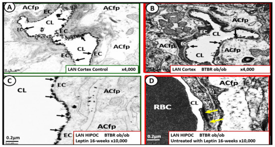 Leptin replacement in the obese diabetic BTBR ob/ob protects the brain endothelial cell glycocalyx (ecGCx) in cortical layer III and hippocampus. Panel A demonstrates the continuous decoration of the ecGCx with lanthanum nitrate (LAN) staining in the heterozygous non-diabetic control model cortical layer III (arrows). Panel B depicts the marked attenuation and/or loss of the ecGCx in the obese diabetic BTBR ob/ob model cortical layer III and note when the ecGCx was present it was clumped and discontinuous (arrows). Panel C also demonstrates the continuous decoration of the ecGCx in hippocampus CA-1 regions of the BTBR ob/ob models that were treated with intraperitoneal leptin for 16-weeks and stained with LAN (arrows) and the ecGCx is comparable to the control model in panel A and that the ecGCx is continuous. Panel D depicts the complete loss of the ecGCx by LAN staining in the hippocampus CA-1 regions of the BTBR ob/ob and note that the tight and adherens junction (TJ/AJ) remain intact (yellow arrows). The loss of the first barrier of the tripartite BBB may result in increased permeability. Images provided by CC 4.0 [52]. Magnification ×4000; scale bar = 0.5 μm in panels A and B. Magnification ×10,000; scale bar = 0.2 µm in panels C and D. ACfp = astrocyte foot process; Cl = capillary lumen; BEC = brain endothelial cell; HIP and HC = hippocampus CA-1 regions.