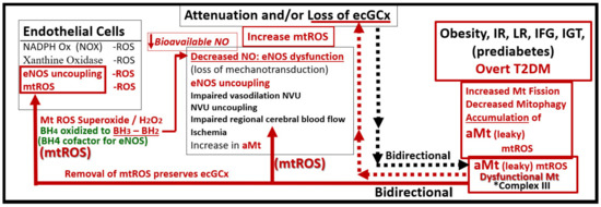Emerging evidence may suggest a possibility for a bidirectional relationship between aberrant Mt (aMt) and the endothelial glycocalyx (ecGCx) dysfunction and/or loss in endothelial cells, including brain endothelial cell(s) (BECs) and possibly other organs in obesity, insulin resistance (IR), leptin resistance (LR), metabolic syndrome (MetS), and type 2 diabetes mellitus (T2DM). This figure illustrates that there may be a bidirectional relationship between aMt and dysfunction, attenuation, and/or loss (shedding) of the brain BECs ecGCx. Note that this illustration establishes the role of oxidant stress—reactive oxygen species (ROS) in BECs and specifically mitochondrial ROS (mtROS) (left-hand box). Further, it establishes the important role of the dysfunctional attenuated and/or loss of the ecGCx in the brain (center box). Next, it establishes that obesity, IR, LR, impaired fasting glucose (IFG), impaired glucose tolerance (IGT), and overt T2DM are related to increased Mt fission, decreased mitophagy, and the accumulation of leaky aMt that leak mtROS (right-hand box). Further, this image depicts that these leaky aMt may be responsible for the attenuation and/or loss of the ecGCx (red-dashed arrows) and that, in turn, may result in the loss of the ecGCx that may contribute to an increase in aMt (black-dashed arrows). Importantly, mtROS superoxide or H2O2 could oxidize the essential tetrahydrobiopterin (BH4) cofactor that is absolutely essential for the eNOS enzyme to produce nitric oxide (NO) and result in eNOS uncoupling, which would ultimately result in decreased bioavailable NO. This bidirectional interaction could result in a vicious cycle, which could be interrupted by preventing the accumulation of aMt (improved mitophagy) or preventing the dysfunction, attenuation, and/or loss (shedding) of the ecGCx [38,59,60,61,62,63,64,65,66,67,68]. The asterisk signifies emphasis of complex III.