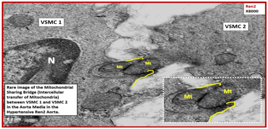 Cell-cell communication is a process necessary for physiological tissue homeostasis and is frequently impaired or altered in many disease states such as obesity, IR, impaired glucose tolerance, T2DM, and hypertension [66,67]. Importantly, intercellular transfer of mitochondria is rarely observed but is known to occur in certain stress states such as hypertension in the aorta [66,67]. In the stressed cells of the descending aortic tunica media in the Ren2 rat model, the author was able to identify this rare process between two VSMCs from an ex vivo model and indeed, Mt know no boundaries (Figure 21) [68].