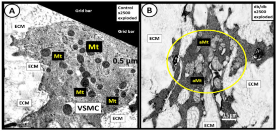 Aberrant mitochondria (aMt) in the obese, insulin resistant, diabetic db/db model vascular smooth muscle cell(s) (VSMCs) in the descending aorta. Panel A demonstrates the markedly electron-dense healthy mitochondria (Mt) in the cytoplasm of a non-proliferative VSMC. Panel B depicts a cluster of hyperlucent aberrant Mt (aMt) (encircled with yellow line) in the cytoplasm of a proliferative VSMC with loss of the electron-dense Mt matrix and loss of crista as compared to the control C57BLKS/J models in panel A. Original Magnification ×2500; intact scale bar = 0.5 μm. These images are exploded in a like manner with the scale bars intact to emphasize the normal control electron-dense Mt in panel A and the aMt in the db/db models in panel B. The original images for this figure are from the experiment with permission [69]. ECM = extracellular matrix.