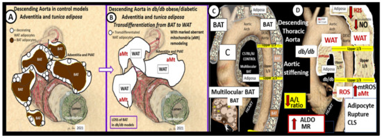 Importantly, the remodeling of the tunica adiposa results in the loss of the anticontractile and protective mechanisms of the normal healthy BAT in the descending thoracic aorta [69]. The transdifferentiated and remodeled WAT of the PVAT in the upper 1/3 of the descending thoracic aorta of db/db models demonstrates aMt and inflammatory crown-like structures (CLS) (Figure 25).