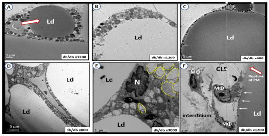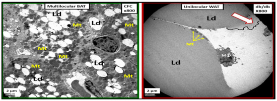 Comparison between multilocular brown adipose tissue (BAT) in control (CFC) perivascular adipose tissue (PVAT), which transdifferentiates to unilocular white adipose tissue (WAT) in the obese, insulin resistant, diabetic db/db model. The left-hand panel demonstrates the multilocular BAT in the CFC control models in the descending thoracic aorta PVAT with its multiple mitochondria (Mt). The right-hand panel depicts the unilocular transdifferentiated WAT with the adherence of an inflammatory macrophage (MΦ) in the diabetic db/db model. Note the rupture of the plasma membrane with leakage of inciting inflammatory lipids into the interstitium (open arrow) that has no Mt and also the thinned small Mt (closed arrows) in the adjacent adipocyte. This image is from the experiment in reference [69]. Ld = lipid droplet.
