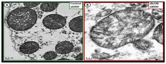 Brain mitochondria are essential to regulate neuronal synaptic transmission with high energetic requirements. Therefore, the remodeling of the normal Mt to an aMt phenotype could result in a loss of these normal functions and result in neuronal dysfunction in T2DM due to impaired mitochondrial bioenergetics and brain hypometabolism [32,33,34,35,36,37]. Mitochondrial dysfunction and damage are implicated in the pathogenesis of multiple neurological diseases. Virtually, all of the cells within the brain frontal cortex in layer III of the grey matter in the obese diabetic, female 20-week-old db/db models demonstrate aMt (Figure 9) [32,33,34,35,36].
